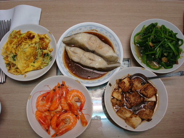 香菜煎蛋、清蒸鱈魚(醬油烏醋口味)、炒菠菜、阿母年前煮的蝦子和敝人特製紅燒豆腐