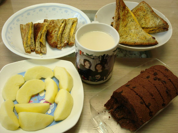 又一天:(前一晚做了)自製豆漿+全麥土司裹蛋汁煎夾起司+蘋果+彌月巧克力蛋糕