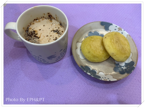 躺在床上一陣子後,肚子餓了才爬起來煎了兩顆蛋、熱了昨天剩的一點筆管麵、蒸了芝麻包、再一盒義美厚豆花,一次解決早餐&午餐。
