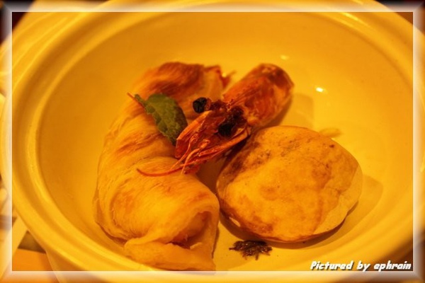 這道菜很好玩,千層蝦是派皮包住的蝦,
