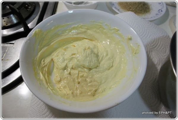 Step3. 室溫放軟的奶油乳酪切小塊,再用打蛋器打至霜狀(懶婦沒切直接打)後,分兩次加入三顆蛋黃攪拌均勻,之後再加入檸檬汁繼續攪拌。