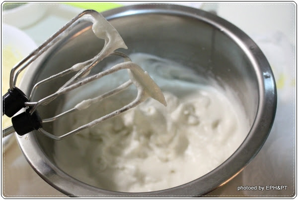 Step4. 將三顆蛋白用中速打出泡沫,加入一半的細砂糖,