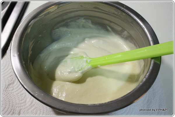 4.「蛋黃麵糊」和「蛋白霜」要拌得均勻。混合均勻後的麵糊是有光澤及順滑的。