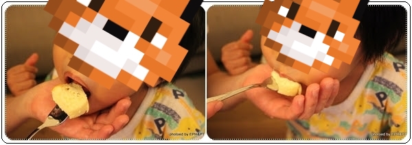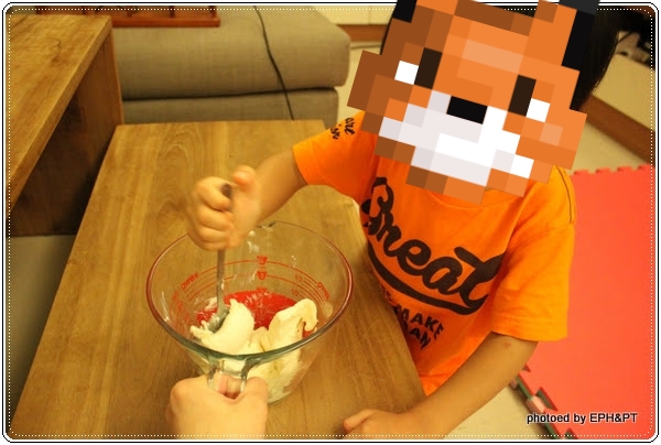 ★ 第二次使用童工讓小豬蛋參與,隨便用湯匙攪攪,成果就還留有顆粒。