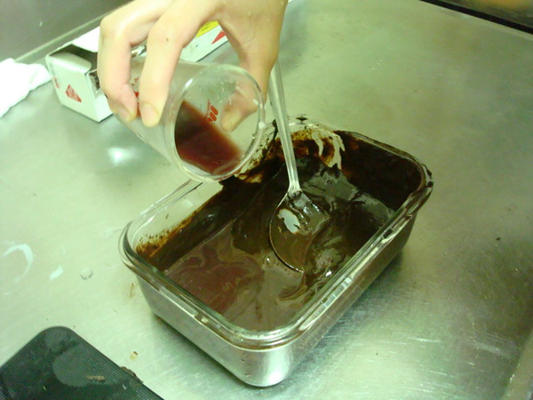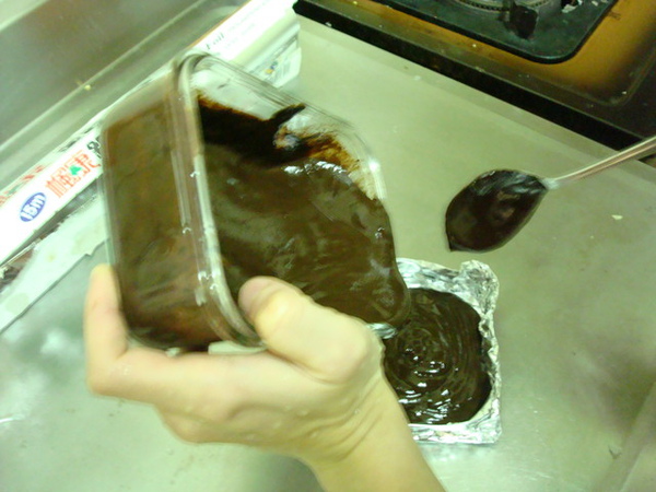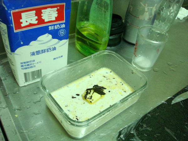 3. 將巧克力碎片混入融化的牛油牛奶裡攪拌均勻……(畫面中就是臭酸掉的鮮奶油)