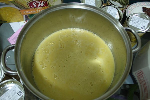 3.過濾後的玉米醬汁加入整瓶鮮奶攪拌文火煮沸