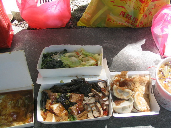 走步道以前,大家先圍著吃買來的素食餐點,